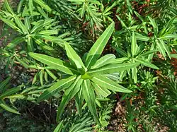 Euphorbia ceratocarpa is a species of flowering plant in the spurge family Euphorbiaceae, native to the Island of Sicily and southern Italy. Growing to 1.7 m (5.6 ft) tall and wide, it is an evergreen perennial or subshrub bearing long, narrow leaves with a prominent white midrib,[2] and clusters of green and yellow flowers in summer. The flowering period may be extended in favourable locations. It is valued in cultivation for its vivid flowers, and its ability to survive drought conditions. Though hardy down to −10 °C (14 °F) it is seen at its best in a warm, sheltered position. It has gained the Royal Horticultural Society's Award of Garden Merit.[3][4]