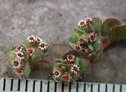 Euphorbia setiloba is a species of euphorb known by the common name Yuma sandmat. It is native to the southwestern United States and northern Mexico, where it grows in dry habitat. This is a small, clumping annual herb with slender stems lined with pairs of tiny hairy leaves. Each leaf is just a few millimeters long and oval in shape with a bluntly pointed tip. The minute inflorescence is a cyathium less than two millimeters wide. It has distinctive appendages which are white with a few narrow, sharp-pointed lobes. There is a red nectar gland at the base of each. At the center of the appendages are the actual flowers, one female and several male. The ovary of the female flower develops into a hairy, spherical fruit about a millimeter wide.