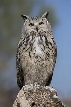 The fourth and most famous derivation of the evolutionary line that includes the Eurasian eagle-owl is the great horned owl, which appears to have been the result of primitive eagle-owls spreading into North America.[8][44] According to some authorities, the great horned owls and Eurasian eagle-owls are barely distinct as species, with a similar level of divergence in their plumages as the Eurasian and North American representations of the great grey owl or the long-eared owl.[8] More outward physical differences exist between the great horned owl and the Eurasian eagle-owl than in those two examples, including a great size difference favoring the Eurasian species, the great horned owl's horizontal rather than vertical underside barring, yellow rather than orange eyes, and a much stronger black bracket to the facial disc, not to mention a number of differences in their reproductive behaviour and distinctive voices.[19][44] Furthermore, genetic research has revealed that the snowy owl is more closely related to the great horned owl than are Eurasian eagle-owls.[19][43] The most closely related species beyond the Pharaoh, Indian, and Cape eagle-owls to the Eurasian eagle-owl is the smaller, less powerful and African spotted eagle-owl (B. africanus), which was likely to have divided from the line before they radiated away from Africa. Somehow, genetic materials indicate the spotted eagle-owl appears to share a more recent ancestor with the Indian eagle-owl than with the Eurasian eagle-owl or even the sympatric Cape eagle-owl.[19][45] Eurasian eagle-owls in captivity have produced apparently healthy hybrids with both the Indian eagle-owl and the great horned owl.[5][8] The pharaoh, Indian, and Cape eagle-owls and the great horned owl are all broadly similar in size to each other, but all are considerably smaller than the Eurasian eagle-owl, which averages at least 15–30% larger in linear dimensions and 30–50% larger in body mass than these other related species, possibly as the eagle-owls adapted to warmer climates and smaller prey. Fossils from southern France have indicated that during the Middle Pleistocene, Eurasian eagle-owls (this paleosubspecies is given the name B. b. davidi) were larger than they are today, even larger were those found in Azerbaijan and in the Caucasus (either B. b. bignadensis or B. bignadensis), which were deemed to date to the Late Pleistocene.[8] About 12 subspecies are recognized today.[3]