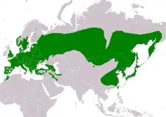 The Eurasian nuthatch's breeding range extends across temperate Eurasia from Great Britain (but not Ireland) to Japan.[11] It is found between the 16–20 °C (61–68 °F) July isotherms,[12] north to about latitude 64°N in western Russia and 69°N in Siberia. It breeds south to the Mediterranean in Europe, although it is absent from the islands, other than Sicily, and in most of Russia the southern boundary is around 54–55°N. In the east, the range includes most of China and Taiwan and much of Korea.[11] It has occurred as a vagrant in Lebanon[1] and the Channel Islands, and the nominate race has been recorded a few times in Finland where S. e. asiatica is the normal form.[12]