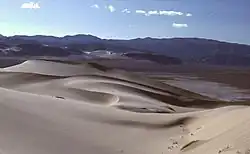 The Eureka Valley Sand Dunes are located in the southern part of Eureka Valley. Although covering an area of only 3 square miles (7.8 km2), the dunes rise approximately 680 feet (210 m) above the surrounding valley floor, making them one of the highest dune fields in North America.[1] Eureka Valley is a basin and range structural valley oriented northwest–southeast and enclosed by the Last Chance Range to the east and the Saline Range to the west. The Eureka Dunes themselves are located in the southeasternmost tip of the valley and trend north–south, parallel to Last Chance Range. According to a USGS survey map, the surrounding mountain ranges contain rocks that date back to the Mississippian and Cambrian periods while the surficial deposits on the valley floor are made up mainly of alluvium dating to the Quaternary period.[2] They are also classified as booming sand dunes, one of only about forty worldwide.[3]