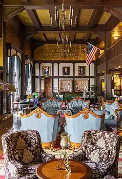 The 93,000 sq ft (8,600 m2) hotel, which fully occupies a city block, has had up to 104 guest rooms, including 99 rooms and five full suites. The hotel has historically contained up to three restaurants, two bars, two saunas, an indoor spa,[8] and nine meeting venues, all of which has been supported by up to 140 employees.[9] Resplendent with its courtyard (now primarily a swimming pool), grand entry, great lounge, and giant fireplace, and constructed of Redwood, it is the largest conference facility and third largest lodging property in the region.