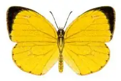 Adults are mostly yellow with an evenly rounded black area on the tips of its forewings Additionally, it had black dots on the edges of its hindwings where its veins end and the underside of its hindwings are a yellowish orange.[3][2] The wingspan is about 30 mm (1.2 in).
