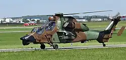 The Tiger HAP/HCP (Hélicoptère d'Appui Protection, French for "Support and Escort Helicopter" / Hélicoptère de Combat Polyvalent[90] French for "Multipurpose Combat Helicopter"[91]) is a medium-weight air-to-air combat and fire support helicopter built for the French Army. It is fitted with a chin-mounted GIAT 30 mm gun turret and can carry 68 mm SNEB unguided rockets or 20 mm machine cannons for the fire support role as well as Mistral air-to-air missiles. France's 40 HAP were delivered by 2012 at a cost of €27m/unit (~US$36m) in 2012 prices.[92] In December 2015, France decided to upgrade its entire existing Tiger fleet to the HAD standard by 2025.[17]