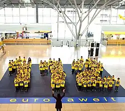 A lot of actions are taking place around Europe every year to celebrate European 112 Day. Some are organized by politicians and government officials, other by rescue services, firefighters and non-governmental organizations. In 2018, a whole variety of events dedicated to the common European emergency call were arranged in at least 23 member states of the European Union as well as in Georgia, Kosovo and Iceland.[6] In Germany, the supercentenarian Edelgard Huber von Gersdorff, who is 112 years old and currently the oldest German woman, became honorary patroness of the campaign "One Europe – one number!", which aims at raising awareness for the European Emergency Number 112.[7] In Belgium, the Manneken Pis, one of the most well-known landmarks of Brussels, was dressed up in a costume with the European flag and the number 112 on it by the campaign "European Emergency Number Association".[8] In Ireland, the emergency number was promoted at the annual Young Scientist and Technology Exhibition by the Emergency Call Answering Service (ECAS).[9] Many other representatives and associations of national emergency rescue services, like the National Federation of Firefighters of France (FNSPF),[10] the Fire and Rescue Service of Latvia[11] and the Luxembourg Rescue Services Agency,[12] took different actions in order to educate the general public about the significance and the appropriate use of the European emergency call. European 112 Day 2018 has also been a major subject in the social media; with hashtags like #112day2018 and #Isupport112 going viral.