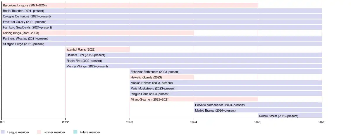 In the run-up to the 2023 season, Madrid was announced as expansion city. Leipzig Kings dropped out during the 2023 season. Helvetic Guards were replaced by a new Swiss team in April 2024.