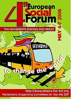 The fourth European Social Forum was held in Athens,[5] Greece on 4–7 May 2006. According to the organizers, more than 35,000 registered. The demonstration on 7 May, Saturday afternoon, was announced by the media to have a participation of 80,000 demonstrators, a record in Athens since the anti-war mobilisation on February 15, 2003.