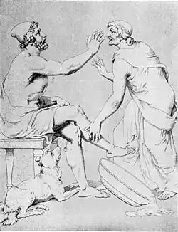 Eurycleia was the only person to recognize Odysseus without him first revealing himself (as he did to Telemachus) after he returned home from the Trojan War. After he entered his own house as a guest of Penelope disguised as a beggar, Eurycleia bathed him and recognized him by a scar just above his knee, which he got from a boar while boar hunting with his grandfather Autolycus.[1] Odysseus stopped her from telling Penelope or anyone else (except Telemachus, who already knew) in the house of his true identity.