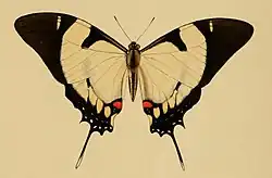It is a large butterfly with a wingspan around 85 mm , white in colour with a slightly pointed apex with two long thin tails at the posterior. The forewings have a brown apex and a brown border. The hind legs show blue lunules in the brown border and a red anal spot