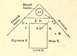 In 1908, the Society for Psychical Research (SPR) appointed a committee of three to examine Palladino in Naples. The committee comprised Mr. Hereward Carrington, investigator for the American Society for Psychical Research and an amateur conjurer; Mr. W. W. Baggally, also an investigator and amateur conjurer of much experience; and the Hon. Everard Feilding, who had had an extensive training as investigator and "a fairly complete education at the hands of fraudulent mediums."[10] Three adjoining rooms on the fifth floor of the Hotel Victoria were rented. The middle room where Feilding slept was used in the evening for the séances.[43] In the corner of the room was a séance cabinet created by a pair of black curtains to form an enclosed area that contained a small round table with several musical instruments. In front of the curtains was placed a wooden table. During the séances, Palladino would sit at this table with her back to the curtains. The investigators sat on either side of her, holding her hand and placing a foot on her foot.[44] Guest visitors also attended some of the séances; the Feilding report mentions that Professor Bottazzi and Professor Galeotti were present at the fourth séance, and a Mr. Ryan was present at the eighth séance.[44]