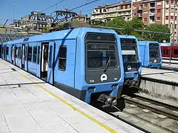The 200 series EMUs were built by CAF, Babcock & Wilcox and Westinghouse in 1985.[20][21] They replaced the trains that Euskotren had inherited from its predecessor Ferrocarriles y Transportes Suburbanos (FTS) on the Bilbao-Plentzia line.[20] After that line was incorporated into line 1 of the Bilbao metro in 1995, the 200 series trains operated services throughout the Euskotren network.[20] The trains originally had three cars, but all were added a fourth one between 1996 and 1999.[20] The last trains were withdrawn from service in late 2018.[22]