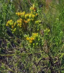 Euthamia occidentalis is a scrubby perennial plant with many green stems which age into a dull brownish-green, and green small leaves. It has plentiful yellowish clusters of flowers. Flowers bloom July to November.[2]
