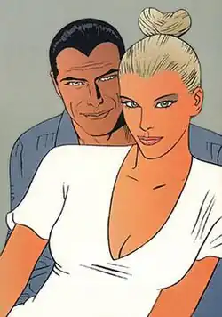 Eva is the girlfriend and sidekick of criminal mastermind Diabolik; like him, she is a master thief with expertise in gathering information, bypassing security measures, and utilizing lifelike masks as a means of deception. She is typically portrayed as an attractive blonde young woman; she drives a white E-Type Jaguar, and usually goes into action wearing a heavy sweater and trousers, no mask (unlike Diabolik) and no revealing clothing. She usually wears her hair up.