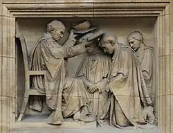 Evans was appointed Pro-Vice-Chancellor of the University of Oxford on 5 November 1874[5] and was made a Doctor of Divinity by decree on 18 October 1878.[6] He then served a four-year stint as Vice-Chancellor of the University of Oxford from 1878 to 1882.[7] During this period he granted the Randolph Hotel its first licence to serve alcohol, and received the key of the door when the work on the new Examination Schools was completed on 13 May 1882. The sculpture over the High Street door of the Schools that shows the Vice-Chancellor awarding degrees (right) is understood to be modelled on Evans.