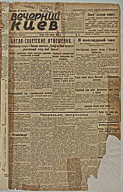 Evening Kyiv (Ukrainian: Вечірній Київ, romanized: Vechirnii Kyiv, pronounced [weˈtʃirn⁽ʲ⁾ij ˈkɪjiu̯]) is a daily newspaper published in Kyiv, Ukraine since 1927, having previously been published as The Evening Gazette in 1906 and from 1913 to 1917. The newspaper is owned by Borys Grinchenko Kyiv Metropolitan University. Although it was once frequently regarded a mouthpiece for Soviet propaganda, the newspaper has been independent since the 1991 dissolution of the Soviet Union and is now regarded as a credible centre-right newspaper.[1] It is Kyiv's oldest newspaper and an important part of the culture of Kyiv, where it is popularly known as Vechirko (Ukrainian: Вечірко).