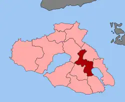 Evergetoulas (Greek: Ευεργέτουλας) is a former municipality on the island of Lesbos, North Aegean, Greece. Since the 2019 local government reform it is part of the municipality Mytilene, of which it is a municipal unit.[2] It is located in the eastern part of the island, inland from the Aegean Sea, but on the Bay of Gera. It has a land area of 88.866 km².[3] Its population was 2,438 at the 2021 census. The seat of the municipality was in Sykounta. Its largest towns are Íppeio, Káto Trítos, Kerameía, Sykoúnta, and Asómatos.