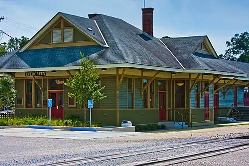 The last train service to utilize the station was Amtrak's Gulf Breeze, which stopped in Evergreen during its run from 1989 to 1995.