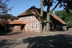 The first estate, Gut I, the so-called Sedelhof, lies east of the village street. It is bordered to the north and east by mill ditches, to the west by the millpond and to the south by the river Örtze. It is thus entirely surrounded by water and only accessible over a wooden bridge. Due to its good location it is thought to be one on the oldest estates in Eversen.[8] The estate was first mentioned in the records in 1424. In a deed of enfeoffment by the Duke of Lüneburg, a certain Carsten von Harling, amongst others, was enfeoffed a farm in Eversen. Because the enfeoffment was "from time immemorial" (von alters hero gehabt)[9] it can be assumed that Gut I had been in the possession of the Harling family from the end of the 14th century. The estate was one of the few in the Principality of Lüneburg that was furnished with a keep (Bergfried), or fortified tower. The present building dates from the year 1792, when the King's Council, Carl August von Harling, had a new manor house and stables built in timber-framed style.