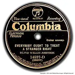 "Everybody Ought to Treat a Stranger Right" is a gospel blues song recorded in 1930 by Blind Willie Johnson with backing vocals by Willie B. Harris, who may have been his first wife.[1] The song was released in 1930 on Columbia 14597 as B-side to "Go with Me to That Land".[2]