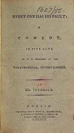 Everyone Has His Fault is a 1793 comedy play by the British writer Elizabeth Inchbald. It premiered at the Theatre Royal, Covent Garden on 29 January 1793.[1] [2] The original cast included William Farren as Lord Norland, William Thomas Lewis as Sir Robert Ramble, John Quick as Mr Solus, Joseph Shepherd Munden as Mister Harmony, John Fawcett as Mr Placid, Alexander Pope as Mr Irwin, James Thompson as Porter, Jane Pope as Lady Eleanor Irwin, Isabella Mattocks as Mrs Placid, Mrs Webb as Mrs Spinster and Harriet Pye Esten as Miss Wooburn. The Irish premiere took place at the Crow Street Theatre in Dublin on 17 July 1793.[3]