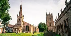 The medieval town developed within the meander of the River Avon, while Bengeworth developed to the east on the opposite bank of the river. In 1055 a market was granted to the Saxon town by King Edward.[13] In the 11th century Leofric, Earl of Mercia, had a hunting lodge at Bengeworth. Leofric founded Holy Trinity Church with his wife Godifu (Lady Godiva). Godifu, who died in around 1067, is possibly buried at the abbey.[24] During the reign of Stephen, King of England, William de Beauchamp erected an adulterine castle at Bengeworth, whose occupants vied for control of the town and abbey. When Abbot William had the castle destroyed between 1149 and 1159, he consecrated the site as a graveyard to prevent the castle being rebuilt.[25][26] Evesham was a borough and market town in the hundred of Blackenhurst in Worcestershire[6] and after 1837 head of the Evesham Poor Law Union, which took responsibility for the administration and funding of the Poor Law, and built a workhouse for that area.[27]