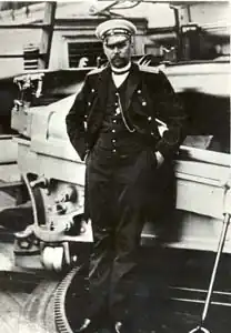 After returning as a teacher of the Helmsman's School on November 13, 1885, he was assigned to the gunboat Ermine and became the acting head of all arriving ships on February 28, 1887, but was transferred the Baltic Fleet within the 3rd Naval Crew on June 4, 1887.[2] From January 18 to March 29, 1888, he took classes on mines and became acting commander of the 6th Company of the training corvette Skobelev on April 29, 1888. In 1891, he was promoted to Captain 2nd Rank and commanded the transport Bakan in 1894 and later, the ship Slavyanka from 1894 to 1895 as well as command of the port of Kronstadt from 1895 to 1897. He was then commander of the Gilyak in 1897, commanded the training ships Voin from 1897 to 1901 and Okean from 1901 to 1904. After being promoted to Captain 1st Rank in 1901, he was given command of the Aurora and took the ship to participate in the Russo-Japanese War.[5] While moored at Nosy Be Egoriev acquired a python and juvenile crocodile which he then took with him when the fleet left the island.[6] During the Battle of Tsushima, Egoriev was killed by fragments of a 75-mm projectile that exploded on the right gangway of the front bridge while he was at the conning tower.[7] The Aurora itself managed to survive the battle and the surviving crew buried him off the coast of the Philippines.[2]