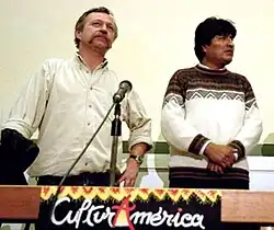 Rising electoral success was accompanied by factional in-fighting, with a leadership contest emerging in the ASP between the incumbent Alejo Véliz and Morales, who had the electoral backing of the social movement's bases.[56] The conflict led to a schism, with Morales and his supporters splitting to form their own party, the Political Instrument for the Sovereignty of the Peoples (Instrumento Político por la Soberanía de los Pueblos – IPSP).[58] The movement's bases defected en masse to the IPSP, leaving the ASP to crumble and Véliz to join the center-right New Republican Force (Nueva Fuerza Republicana – NFR), for which Morales denounced him as a traitor to the cocalero cause.[59] Continuing his activism, in 1998 Morales led another cocalero march from El Chapare to la Paz,[60] and came under increasing criticism from the government, who repeatedly accused him of being involved in the cocaine trade and mocked him for how he spoke and his lack of education.[61]