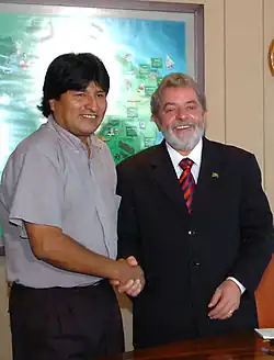 In December 2006, he attended the first South-South conference in Abuja, Nigeria, there meeting Libyan leader Muammar Gaddafi, whose government had recently awarded Morales the Al-Gaddafi International Prize for Human Rights.[143] Morales proceeded straight to Havana for a conference celebrating Castro's life, where he gave a speech arguing for stronger links between Latin America and the Middle East to combat U.S. imperialism.[144] Under his administration, diplomatic relations were established with Iran, with Morales praising Iranian President Mahmoud Ahmadinejad as a revolutionary comrade.[145] In April 2007 he attended the first South American Energy Summit in Venezuela, arguing with many allies over the issue of biofuel, which he opposed.[146] He had a particularly fierce argument with Brazilian President Lula over Morales' desire to bring Bolivia's refineries – which were largely owned by Brazil's Petrobrás – under state control. In May, Bolivia purchased the refineries and transferred them to the Bolivian State Petroleum Company (YPFB).[147]