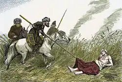 Quartered during the winter of 1757–1758 in Leipzig during the Seven Years' War, he found relief from his irksome military duties in the society of Gotthold Ephraim Lessing. His regiment, the Schenckendorff Grenadiers, entered into summer campaigns. Shortly afterwards in the Battle of Kunersdorf, on 12 August 1759, he was mortally wounded in the forefront of the attack.[3] Thomas Carlyle offers a description of his death, possibly apocryphal: Kleist was attached to Finck's division at the Prussian right. He'd been hit several times by ricochets, and possibly musket balls, perhaps even 12 times. He continued to lead his troops forward, taking a third battery, when he was badly hurt on both arms. His "colonel" (Major Mark K. A. von Schwartz) fell; he led his regiment forward to the fourth battery when a case-shot smashed his leg into pieces; once he fell, Captain Sylvius von Swolinsky took command of the battalion. He fell from his horse, and was carried to the rear. In due course, a surgeon was brought to him, but was killed by case-shot. One of his friends tried to send a carriage to him, to move him out of danger, but it took so long he was cut off by the Russian advance. By evening, the Cossacks stripped him bare, and threw him into the nearest swamp. Later that night some Russian Hussars found Kleist in this situation, took him to a dry place, set a watch fire and gave him some bread. When they had left, the Cossacks returned and took the blanket the Russians had given him. Eventually a Russian cavalry troop passed by; one of their captains, had him sent to Frankfurt in a carriage. Under the care of a professor there, he had surgery and good nursing, although on the tenth night, the bone fell apart, cut an artery, and at 2 a.m. on the 24th he died.[1] He received a soldier's funeral, his coffin borne by 12 Russian grenadiers, and attended by some officers; one staff officer laid his own sword on the bier.[4]