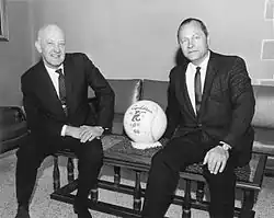 After thirteen years in Kansas City, the Athletics moved to Oakland following the 1967 season. Inspired by his wife, who told him it would be a new frontier that would be good for him, Kauffman joined the forefront for the push for a expansion team in Kansas City, Missouri. On January 11, 1968, he was announced as owner of the new team, soon christened as the Kansas City Royals, bringing major league baseball back to the city for the 1969 season. He hired Cedric Tallis as the first general manager for the team, as he liked what he saw from Tallis when he was an executive of the Los Angeles Angels during their process of becoming a team in 1961.[10] Described by one historian as "too far too ahead of his time" in terms of his management style in innovations, he strived to have the finest organization in baseball, setting a goal for a pennant in five years. Seeing the need to develop players into athletes, he established the Kansas City Royals Baseball Academy in 1971, although it closed three years later due to costs, much to the subsequent regret of Kauffman. He entertained the notions of Earnshaw Cook, an early researcher and proponent of sabermetrics. On April 10, 1973, Royals Stadium opened, and it would host the 1973 Major League Baseball All-Star Game a few months later; the stadium features included a privately funded fountain system that was among the largest in the world.[11] While the Royals did not win a pennant in their fifth season, they won their first division title in 1976 before finally breaking through with a pennant in 1980. Five years later, the Royals won the Series, although it was their last playoff appearance under Kauffman as owner. They reached the postseason seven times in 24 full seasons (1969-1992) with Kauffman as an owner.