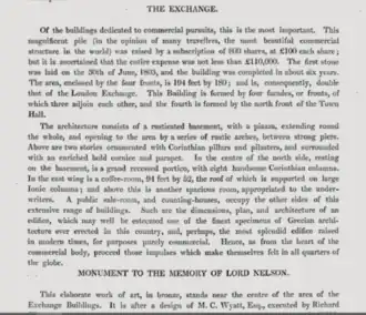 Of the buildings dedicated to commercial pursuits, this is the most important. This magnificent pile (in the opinion of many travellers, the most beautiful commercial structure in the world) was raised by a subscription of 800 share, at 100 each share; but it is ascertained that the entire expense was not less than 110,000. The first stone was laid on the 30th of June, 1803 and the building was completed in about six years. The area eclosed by the four fronts, is 194 feet by 180; and is, consequently, double that of the London exchange. This building is formed by four facades, or fronts, of which three adjoin each other and the fourth is formed by the north front of the Town hall.The architecture consists of a rusticated basement, with a piazza, extending round the whole, and opening to the area by a series of rustic arches, between strong piers. Above are two stories ornamented with Corinthian pillars and pilasters, and surrounded with an enriched bold cornice and parapet. In the centre of the norh side, resting on the basement, is a grand recessed portico, with eight handsome corinthian columns.In the east wing is a coffee room, 94 feet by 52, the roof of which is supported on large ionic columns, and above this is another spacious room, appropriated to the underwriters. a public sale room and counting houses, occupy the other sides of this extensive range of buildings.[3][4]