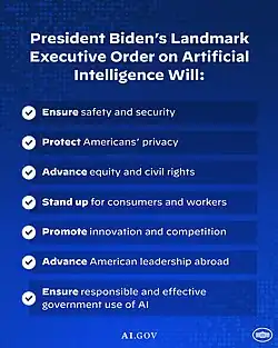 - ^ "FACT SHEET: President Biden Issues Executive Order on Safe, Secure, and Trustworthy Artificial Intelligence". The White House. 2023-10-30. Retrieved 2023-11-12.
