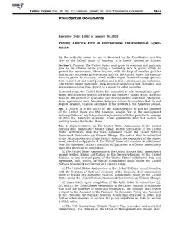 Executive Order 14162, titled "Putting America First In International Environmental Agreements", is an executive order signed by United States president Donald Trump on January 20, 2025, during the first day of his second presidential term. The order directed the immediate withdrawal of the United States from the Paris Agreement and other international climate commitments.