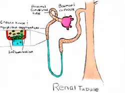 When the protein reaches the kidneys it causes a strain on the anatomical structures reducing its effectiveness as a filter for the body. The protein acts as a dam as it forms into tight aggregates when it enters the renal tubules.[11] In addition, the increased intracellular calcium has greater time to bind due to the blockage allowing for renal calculi to form.[12] As a result this causes urine output to decrease allowing for the uric acid to build up inside the organ. The increased acid concentration allows the iron from the aggregate protein to be released into the surrounding renal tissue.[13] Iron then strips away molecular bonds of the surrounding tissue which eventually will lead to kidney failure if the tissue damage is too great.