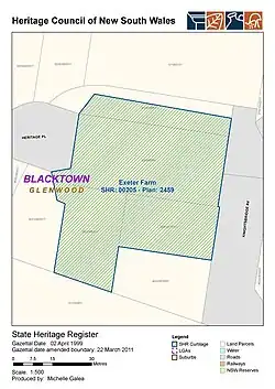 - ^ a b c d e f g h i j k l m n o p q r s t u v w x y z aa ab ac ad ae af ag ah ai aj ak al am an ao ap aq ar as at au av aw ax ay az ba bb bc bd be bf bg bh bi bj bk bl bm bn bo bp bq br bs bt bu bv bw bx by bz ca cb cc cd ce cf cg ch ci cj ck cl cm cn co cp cq cr cs "Exeter Farm". New South Wales State Heritage Register. Department of Planning & Environment. H00205. Retrieved 1 June 2018.