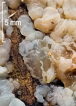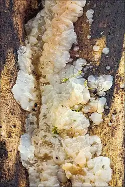 Exidia thuretiana forms shallowly pulvinate (cushion-shaped), gelatinous fruit bodies that individually measure 0.2 to 1 centimetre (1⁄8 to 3⁄8 inch) in diameter.[6] The fruit bodies quickly coalesce, often running along the underside of branches and extending up to 10 cm (4 in) or more. They typically appear undulating or pleated and are whitish, occasionally with ochre or pinkish tints. The upper, spore-bearing surface (hymenium) is smooth and opaque, but is frequently furrowed and folded. It can have a pruinose (powder-like) coating. With age, the hymenium becomes a thin, horny, yellowish film.[7] The spore print is white.[8] The fungus does not have any distinct taste or odor; it is inedible.[6]