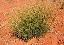 The specific name is derived from the Latin word esparto, referring to a kind of Spanish grass that was used for its fibre. It was first described by Robert Brown, in 1810, having collected the plants on his visit to King George Sound in 1802. One of the species' common names, native cherry, is given to another congener with an edible fruit, Exocarpos cupressiformis; both of these species are known as sorts of Ballart. The Noongar peoples know the plant as Chukk, Dtulya or Merrin.[2]