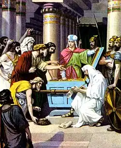 Martin Buber and others noted that the language used to describe the building of the Tabernacle parallels that used in the story of creation.[84] Jeffrey Tigay noted[85] that the lampstand held seven candles,[86] Aaron wore seven sacral vestments,[87] the account of the building of the Tabernacle alludes to the creation account,[88] and the Tabernacle was completed on New Year's Day.[89] And Carol Meyers noted that Exodus 25:1–9 and 35:4–29 list seven kinds of substances—metals, yarn, skins, wood, oil, spices, and gemstones—signifying the totality of supplies.[90]