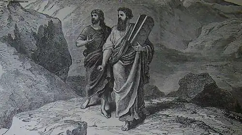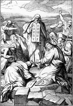 In the continuation of the reading, Moses descended the mountain bearing the two tablets.[33] Joshua told Moses, "There is a cry of war in the camp," but Moses answered, "It is the sound of song that I hear!"[34] When Moses saw the calf and the dancing, he became enraged and shattered the tablets at the foot of the mountain.[35] He burned the calf, ground it to powder, strewed it upon the water, and made the Israelites drink it.[36] When Moses asked Aaron how he committed such a great sin, Aaron replied that the people asked him to make a god, so he hurled their gold into the fire, "and out came this calf!"[37] Seeing that Aaron had let the people get out of control, Moses stood in the camp gate and called, "Whoever is for the Lord, come here!"[38] All the Levites rallied to Moses, and at his instruction killed 3,000 people, including brother, neighbor, and kin.[39] Moses went back to God and asked for God either to forgive the Israelites or kill Moses too, but God insisted on punishing only the sinners, which God did by means of a plague.[40] A closed portion ends here with the end of chapter 32.[41]