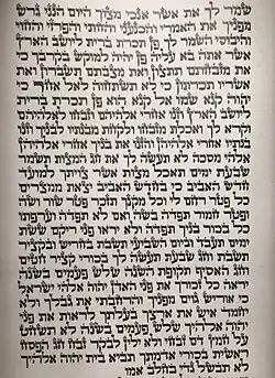 In the continuation of the reading, God told Moses what the people had done, saying "let Me be, that My anger may blaze forth against them and that I may destroy them, and make of you a great nation."[29] But Moses implored God not to do so, lest the Egyptians say that God delivered the people only to kill them off in the mountains.[30] Moses called on God to remember Abraham, Isaac, and Jacob, and God's oath to make their offspring as numerous as the stars, and God renounced the planned punishment.[31] The fifth open portion ends here.[32]