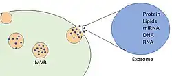 Exosomes are formed through the inward budding of a late endosome, also known as a multivesicular body (MVB).[7] The intraluminal vesicles (ILVs) of the multivesicular body (MVB) bud inward into the endosomal lumen. If the MVB fuses with the cell surface (the plasma membrane), these ILVs are released as exosomes.[8] Exosomes were also identified within the tissue matrix, coined Matrix-Bound Nanovesicles (MBV).[9] They are also released in vitro by cultured cells into their growth medium.[6][10][11] Enriched with a diverse array of biological elements from their source cells, exosomes contain proteins (such as adhesion molecules, cytoskeletons, cytokines, ribosomal proteins, growth factors, and metabolic enzymes), lipids (including cholesterol, lipid rafts, and ceramides), and nucleic acids (such as DNA, mRNA, and miRNA).[12] Since the size of exosomes is limited by that of the parent MVB, exosomes are generally thought to be smaller than most other EVs, from about 30 to 150 nanometres (nm) in diameter: around the same size as many lipoproteins but much smaller than cells.[13][6] Compared with EVs in general, it is unclear whether exosomes have unique characteristics or functions or can be separated or distinguished effectively from other EVs.[2]