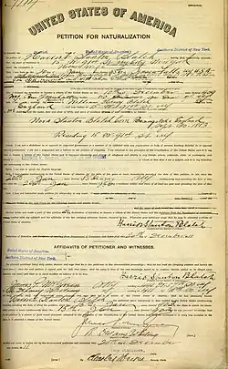 It was not until American born wives of aliens attempted to register to vote, in those states that had granted the vote to women prior to 1919, that the implications of these two sections of the Act were fully understood. Among leading suffragists this act affected were Harriot Stanton Blatch, Inez Milholland, and Crystal Eastman. These three women, all born in the United States and fighting for the right of American women to gain the vote, had married men who were not American citizens and, as a result of the Act of 1907, had lost their American citizenship.[20] Harriot Stanton Blatch attempted to regain her citizenship by filing a petition of naturalization in 1911. However, her husband was still living and had not applied for citizenship himself, so she was ineligible for reinstatement. Following his death, in 1915, she was repatriated following the terms of this act.