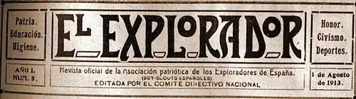 On 27 April 1913, 2397 exploradores gathered at the Atlético Madrid field for the promise ceremony, with the attendance of the kings of Spain. The Madrid districts of Buenavista, with three groups; Palacio, with six groups; Latina, with two; Centro, with four; Congreso, with three; Inclusa with two; Hospicio, with three; and Universidad, Hospital and Chamberí, with two each[27] That same year, the first issue of the magazine El Explorador,[28] and Pedro Rosselló's Exploradores Barceloneses became part of the Exploradores de España.[29]
