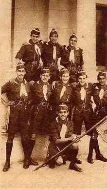 One of the most hostile precedents was the assault on the headquarters of the exploradores loyal to the national association on 28 April 1930,[85] starring a sector of the jovent republicà (republican youth)[16][86] during a student strike, causing the Exploradores Barceloneses to lose their flag. According to the available documentation on Catalan scouting from the National Archive of Catalonia, in 1933 the most Catalanist sector, openly politicized left-wing and akin to the nationalist postulates of the time, the Boy Scouts de Catalunya was organized as an association of regional character whose strong core would be the protagonist of a major split of the Exploradores de España in Catalonia.[87] Among the demands of the breakaway group was to dispense with the use of the national flag in the activities of the association and total independence in its institutional relations with the International Scout Bureau in London.[88] In 1932, in a decentralizing attempt, the Catalan grouping had previously been constituted as the Federación de los Boy Scouts de Cataluña, linked to the Exploradores de España;[7] On 22 February 1933 Carlos Cifuentes Rodríguez resigned as commissioner of Catalonia, and Narcís de Romaguera, head of the Catalanist faction, was dismissed by the National Council which refused to cede autonomy. The fracture was consummated, backed by historical figures of the time of Pedro Roselló, Ramón Soler and Jaume Roca.[89] The honorary presidency of the new institution was offered to Francesc Macià, president of the Generalitat de Catalunya.[90] After the split, the Exploradores de España en Cataluña were reduced to a minimum, their presence limited to the municipalities of Barcelona and Tarrasa, and the autonomous English and French groups.[91][89]