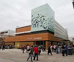 The Colombia Pavilion which was located in Area C of the Expo was designed by Colombian architects Alejandro Puentes and Esteban Castro from the firm 4H. The concept divided the building into three elements. The base was a glass wall imprinted with a series of pictures showing landscapes, people and city developments. The body of the building was in the form of laser-cut PVC panels showing Tumaco's fabric stamps to celebrate their harmonic relationship with the environment. The third part was a lighthouse, landmark and a glowing tower displaying a flock of parrots recalling the colors of the Colombian flag.