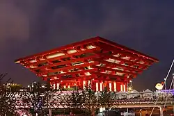The chief architect of the pavilion was He Jingtang, the director of the Architectural Academy of the South China University of Technology.[33] The 63-meter high pavilion, the tallest structure at the Expo, is dubbed "The Oriental Crown" because of its resemblance to an ancient Chinese crown.[18] The architectonic feature of the building was inspired by traditional Chinese roof brackets known as dougong which date back nearly 2,000 years. The exterior is painted in various shades of Chinese red, symbolising Chinese culture and good fortune.