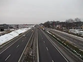 S8 runs through Warsaw and is part of its network of bypass roads. Various fragments were completed between 2010 and 2015.[4][5] It was constructed mostly as an upgrade of the city's existing inner highways. As such, it might be considered not to fully meet the definition of a bypass as it serves both the transit and local district traffic at the same time. In effect, large traffic jams form on this section every day in the peak hours. In the most recent general traffic measurement conducted in 2020 and 2021, S8 in Warsaw recorded the annual average daily traffic of 198'000 vehicles, making it the most busy highway section in Poland.[6]