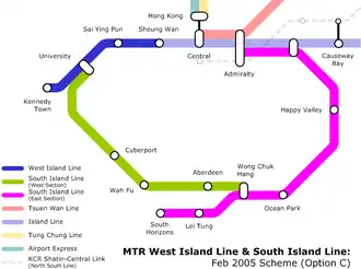 The Extension of Island line to Western District (previously known as West Island line) is a three-station western extension of the Hong Kong MTR's Island line. Construction of the line began on 10 August 2009, and the two westernmost stations on line opened on 28 December 2014; the intermediary Sai Ying Pun station opened on 29 March 2015.[1][2] The first train went into service that day at 6:00 a.m. Hong Kong time.