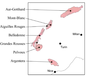 The external massifs are the Argentera in the Alpes Maritimes, the Pelvoux massif and the Belledonne range in the Dauphiné part of the French Alps, the Aiguilles Rouges in the Savoy part of the French Alps, the Mont Blanc Massif at the borders between France, Italy and Switzerland and the Aarmassif and Gotthardmassif in the Central Alps of Switzerland.
