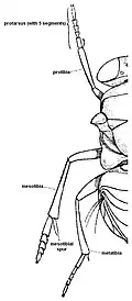 Each leg has six segments: coxa, trochanter, femur, tibia, tarsus, and pretarsus. Typically, each tarsus is subdivided into three to five tarsal segments. The basal segment (closest to the body) is the basitarsus, and the terminal pretarsus has a pair of tarsal claws. The protibia and mesotibia each possess a tibial spur, whereas the metatibia may contain one or two spurs. The protibial spur is generally short and linear if there are three or four tarsal segments and it is usually relatively robust, curved, and forked (or bifurcate) when there are five tarsal segments. The protibial spur (or calcar) and basitarsus are used together to clean the antennae.[4]